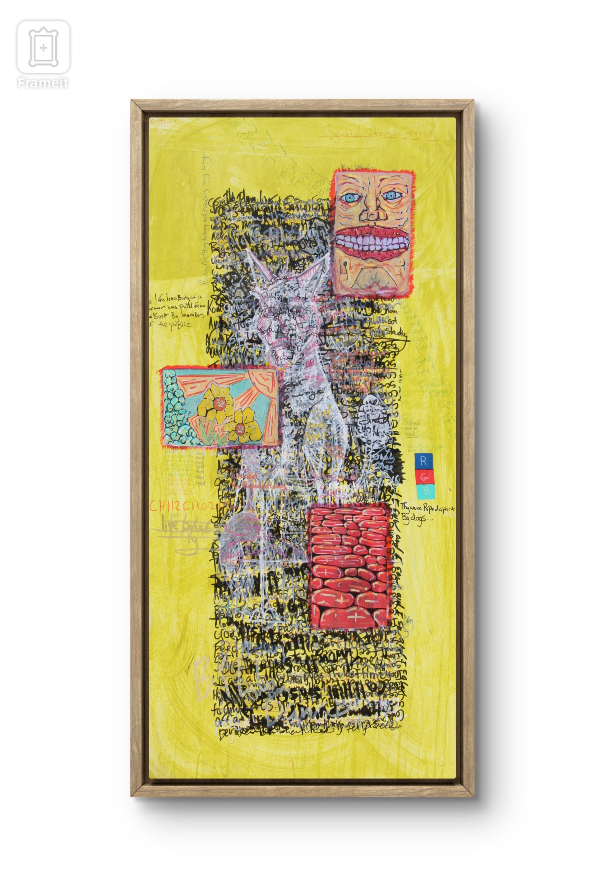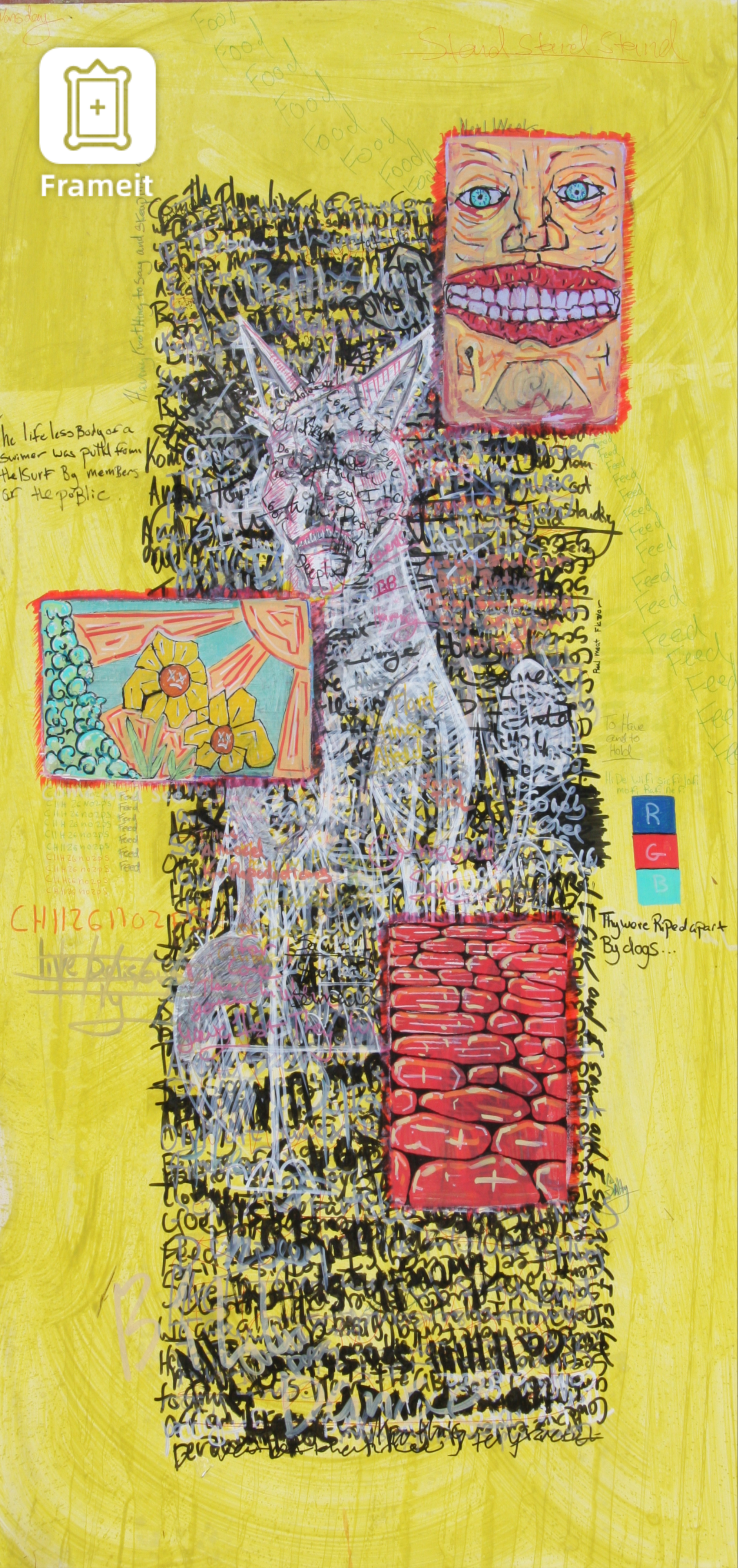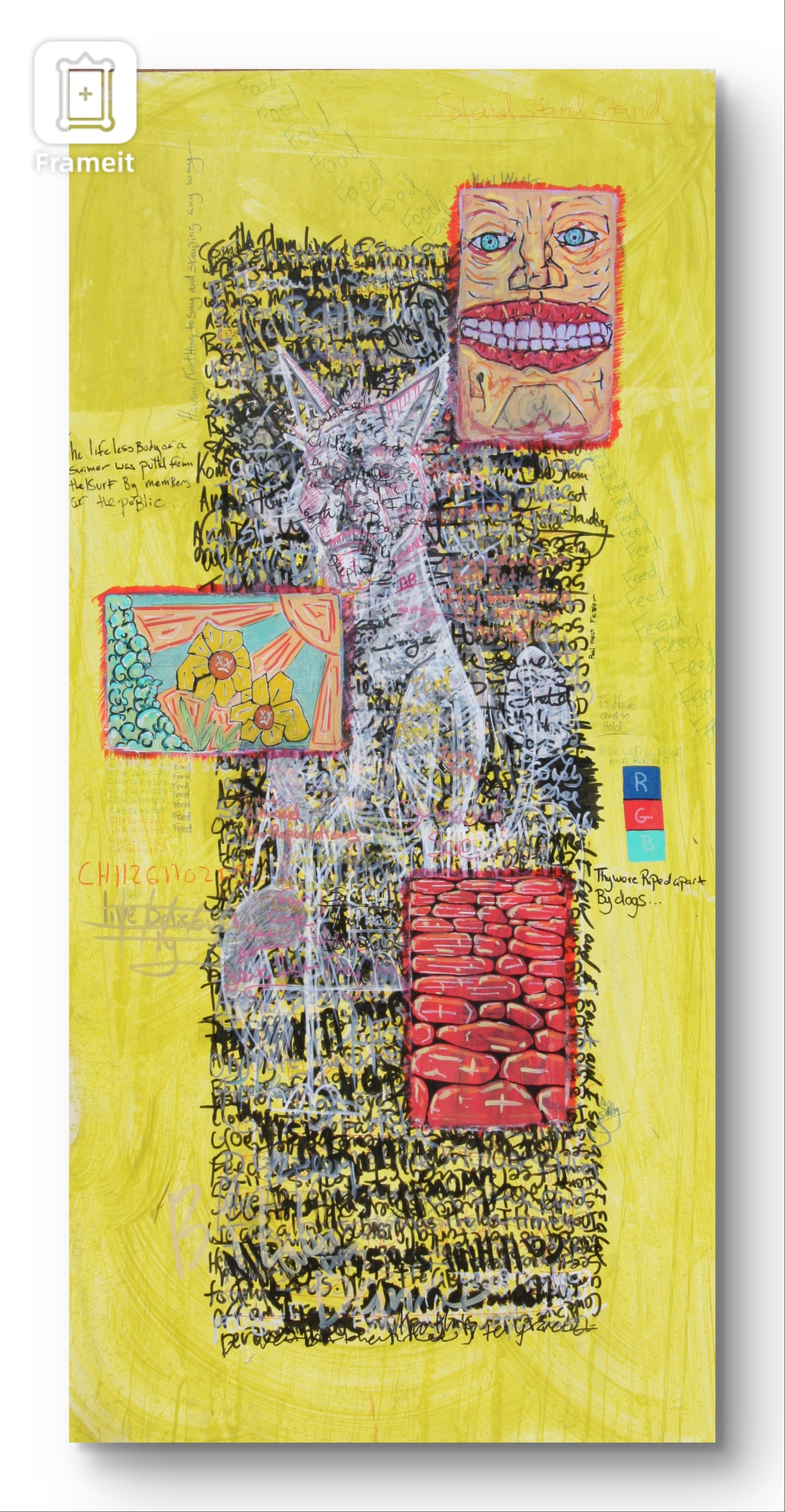 This panel fractures political commentary through dyslexic perception and mythic distortion. A white dog figure floats in a field of scribbled text and chaotic iconography