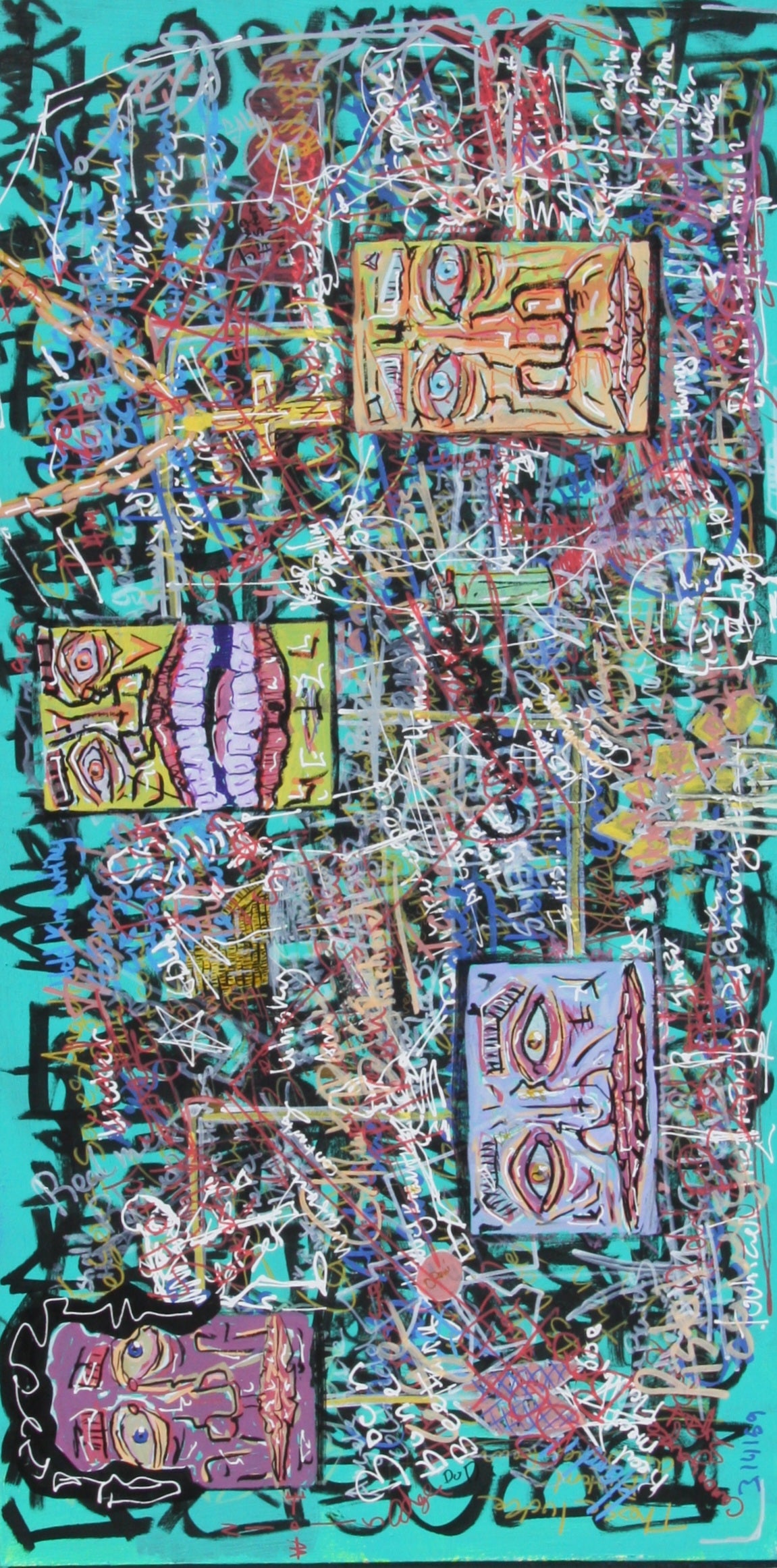 Five distorted faces float in a storm of symbols—mathematical notations, graffiti text, and fractured color blocks. as dyslexic perception and mythic tension collide. This panel channels inner turmoil through visual overload, where intellect fractures into abstraction and identity becomes a recursive equation.